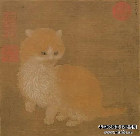 李迪所绘《狸奴小影图》,画中这猫儿:头圆、耳小、尾短、毛长、目光炯炯,按照后人《相猫经》中的形容,它符合一只良种猫的特征,周身毛发金黄均匀,胸前绒毛微微卷曲,看上去虽尚年幼,但也应是只活泼好跃的机灵鬼。此刻它双目圆瞪,正聚精会神地注视着不名之物。《狸奴小影图》右上角有小楷题字曰“甲午岁李迪笔”,甲午为宋徽宗政和四年(1114)。