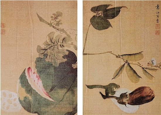夏天各种瓜果先后成熟,花样品种丰富,清代画家袁江的《写生蔬果图页》展示了多种果蔬。此图绢本设色,纵32厘米,横22厘米。《写生蔬果图》共两页,一页绘熟裂的西瓜,绿皮红瓤,形神俱备,令人垂涎欲滴。瓜皮绿中泛黄正是熟透的征象。摘瓜人为使瓜保持新鲜,特留有一截瓜藤和几片瓜叶;一页绘紫茄、白茄和青绿的豆荚,藤上小花洁白,绿叶青翠,看上去淡雅清新。这些写生作品以没骨法绘制,栩栩如生,形象逼真,尤其是一些细节勾染到位,可见作者观察生活的细腻独到。