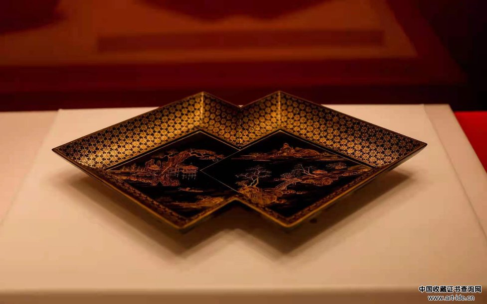 乾隆款黑漆描金山水人物图方胜式盘