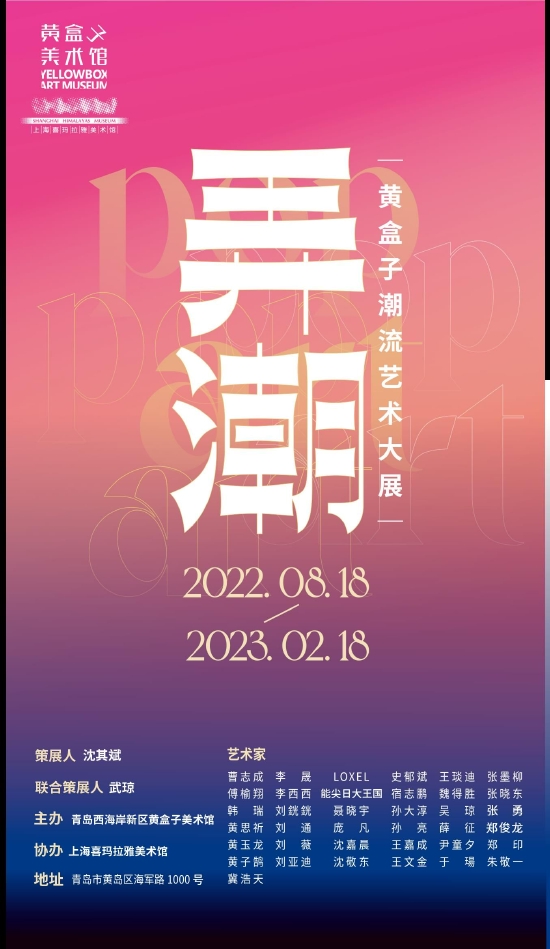 《弄潮——黄盒子潮流艺术大展》发布会于8月6日下午2点在青岛西海岸新区黄盒子美术馆举行。此次潮流艺术大展由青岛市文联与青岛市文化旅游局指导,青岛西海岸新区黄盒子美术馆主办,上海喜玛拉雅美术馆联合主办,青岛中纺亿联时尚产业投资集团有限公司作为支持单位。由上海喜玛拉雅美术馆馆长、青岛西海岸新区黄盒子美术馆馆长沈其斌出任策展人,武琼担任联合策展人。