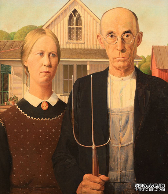《美国哥特式》是美国文化的五大象征之一,作者为芝加哥艺术学院格兰特·伍德。1930年8月,伍德在Iowa南部的一个小镇看到一所颇具哥特式风格的房子,它建于1880年代,有五个房间。此建筑物的紧凑和坚实的设计,尤其是阁楼上的哥特式窗户,给伍德留下了非常深刻的印象。他想象着一个农夫和他的女儿站在房子前面,然后拍下这个房子的照片带回了他的工作室。他请他62岁的牙医和他30岁的妹妹作为画中人物的模特,并让他们穿上19世纪维多利亚时期的衣服。虽然在画中两人是站在一块的,但实际上这两个人物是在不同的场合下完成的。