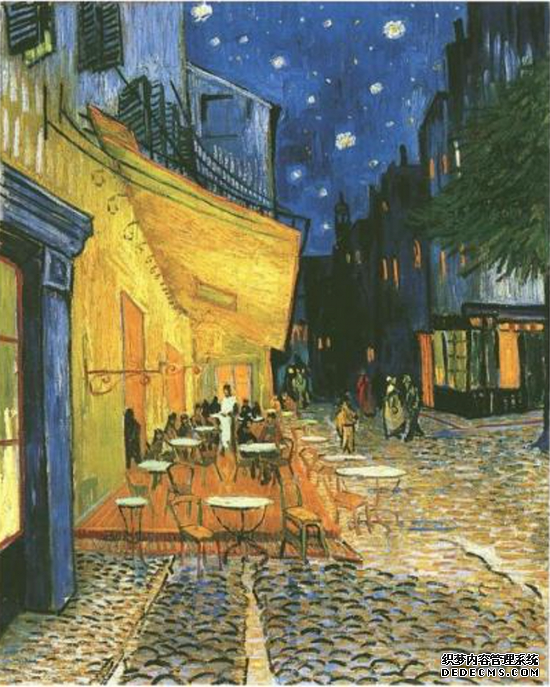 《夜间的露天咖啡座》是由文森特·梵高于1888年9月创作的一幅画布油彩画,现收藏于克罗勒·穆勒博物馆(荷兰奥特罗市)。该画是梵高星光三部曲的第一部,画面描绘了阿尔勒一家咖啡馆的室外景色,室内温暖而明亮的黄色灯光洒在屋外鹅卵石铺成的广场上,在深蓝色的夜空中,群星闪烁,宛如朵朵灿烂的灯花。整幅画面与画家笔下的咖啡馆室内景形成了鲜明的对比,色彩明丽,气氛温馨恬适。
