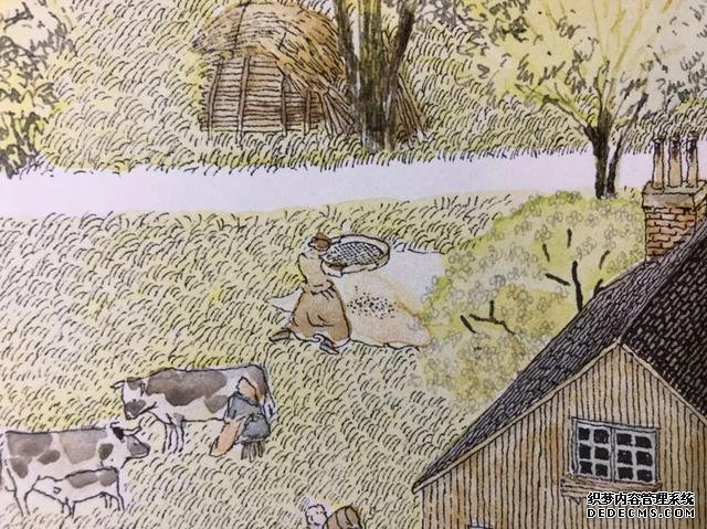 他在绘本当中也为读者藏了数不尽的惊喜,《旅之绘本》当中藏了数不清的名画,如乡间的小路边,一个妇人在家门前筛着谷子,而看似是无心之笔,其实则是居斯塔夫的一幅名画《筛谷的妇女》。