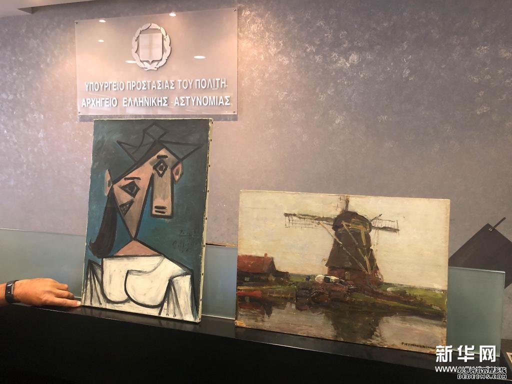 6月29日,警方在希腊雅典展示失窃的毕加索作品《女人头像》(左)和皮特·蒙德里安创作的《磨坊》。新华社发