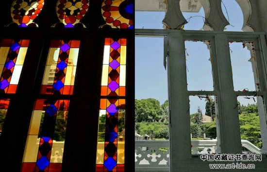 组合图展示了爆炸前后博物馆彩色玻璃窗