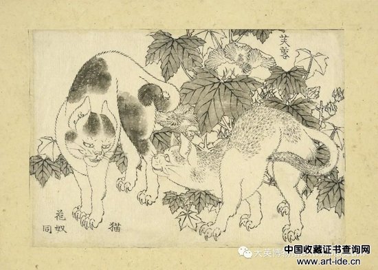 葛饰北斋,《猫与芙蓉花》(出自《万物绘本大全》),纸本墨笔,1820-40年代。作品由为纪念其父母鲁道夫·布赫与茱莉·布赫(Rudolph and Julie Buch)而特别设立的特雷莎·格尔达·布赫遗产基金(Theresia Gerda Buch Bequest)和英国艺术基金会(Art Fund)赞助购藏
