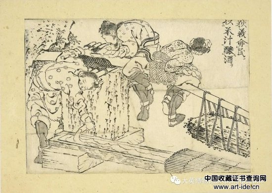 尽管当时日本实行锁国政策,但从这些版画画稿的内容我们可以看出那一时代艺术家的想象力和创造力并未受政治时局的限制。写有“印度-中国”注释的一帧应为绘本的卷首图,系列中有许多画稿通过想象描绘了这两大亚洲文明的远古历史场景。葛饰北斋也许会想,即使我不能真的去中国,但你不能阻止我的想象跨越时空去探寻人类文明的起源之处。艺术家将印度佛教的源起形象化,并表现了古代中国人如何定居、农耕火种、发明度量衡,甚至如何酿酒的历史过程。
