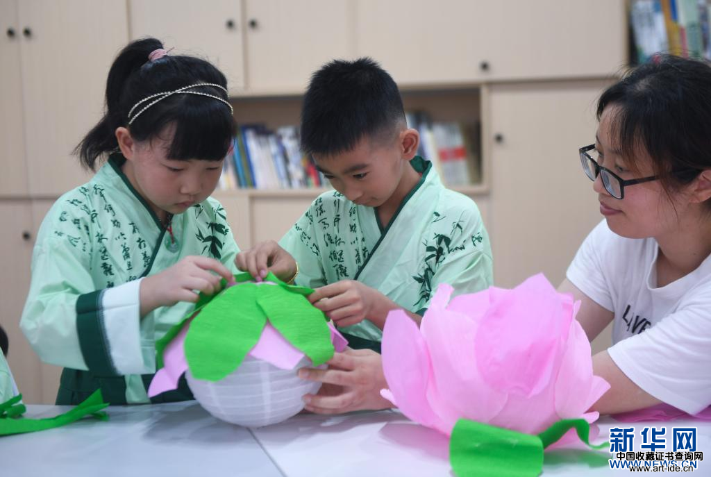 8月11日,工作人员与社区里的小朋友一起制作荷花灯。 新华社记者 徐昱 摄
