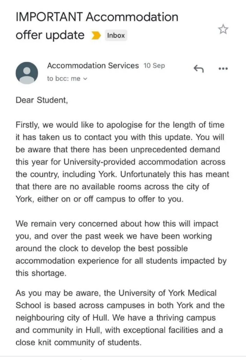 由于约克大学住宿短缺,在9月10日发给学生的信中,校方表示将在邻近的赫尔大学校园内或附近为学生提供住宿,在这些地方住宿的学生可以获得10%的租金减免。信中校方还提到,约克大学在赫尔市也有分支机构。