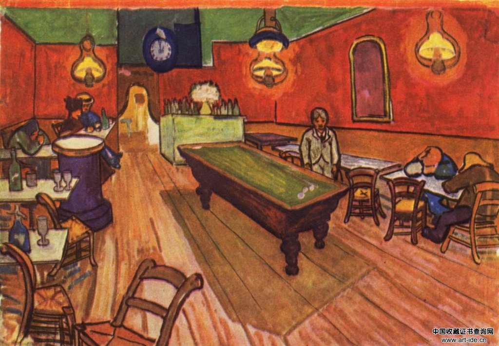 这幅右下角有着梵高签名的画作描绘的是室内的咖啡馆的场景,处在画面中间位置的门帘半开半掩着,据推测门后面有很多独立的小房间。五位顾客沿着墙坐在左右两侧,服务员站在灯光下面面对着观众,在他一侧房间中间部位一有张台球桌。