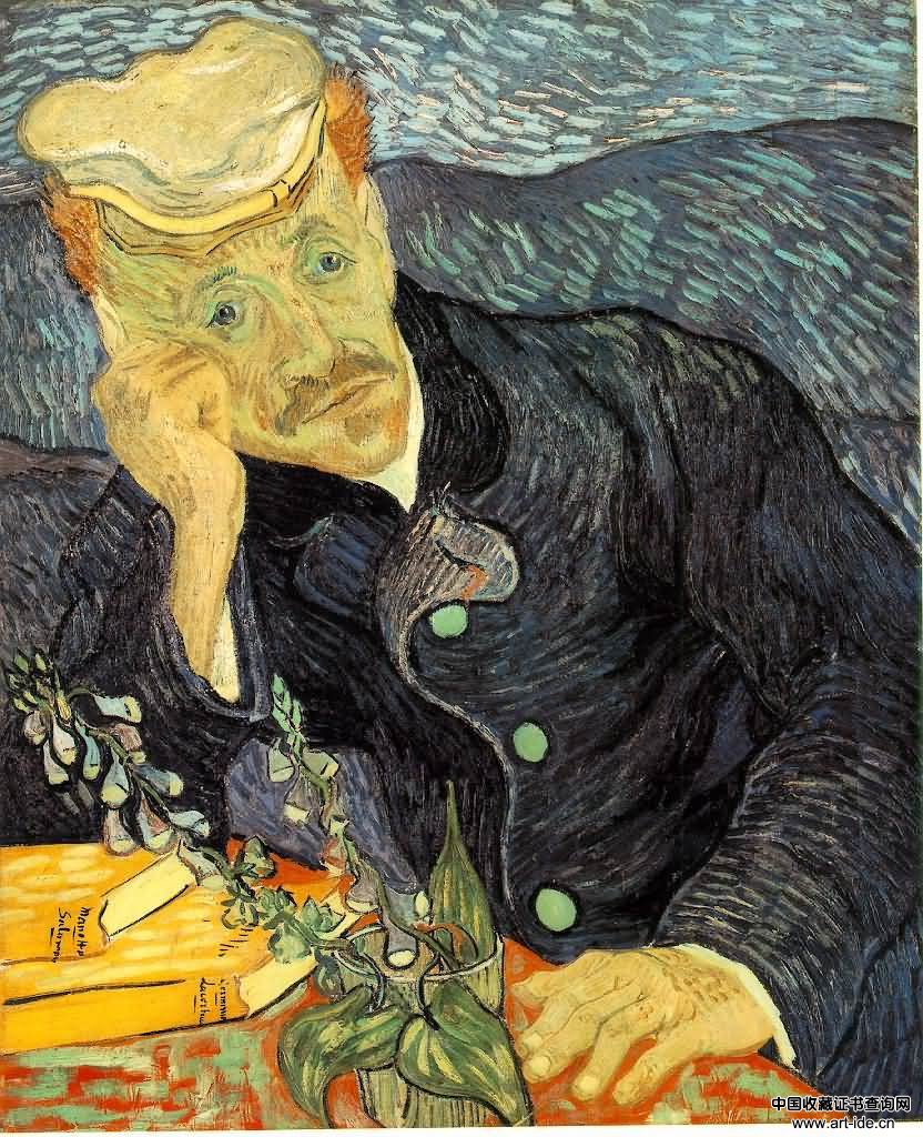 嘉舍医师生于1828年,死于1909年,是一位精神科医生,与许多印象派画家有交情,他自己也作画,并收集许多美术品,尤其是印象派作品。梵高在信中记述他们初次见面的情形,说他给人一种与众不同的印象。以嘉舍医师为模特儿的肖像画,有油画两张,版画一张。关于这一幅,梵高认为与他在圣-雷米时期所画的自画像同调,而弯曲螺旋式的线条,则与阿尔勒时期的肖像画中单纯化色面可视为一体,正可以表明嘉舍医师沉郁、心烦的情绪。背景、笔触方向、色彩的装饰与转调等等一切形体的要素,都凝聚其间,因而这张画成为控优越的肖像画之一。