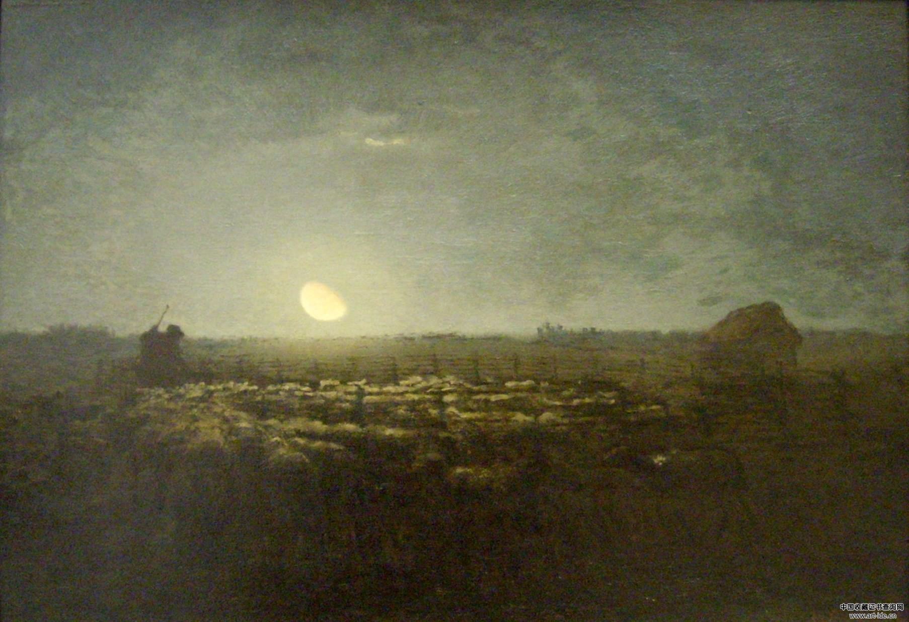 夜空月光下的羊圈是神秘安祥而辽阔的,一轮金黄的月亮已从地平线的东方升起来,它的辐射的金光正在照亮天上漫游的云絮。由远方村庄和树木朦胧的木刻构成的轮廓,使那颗月亮的梦沉浸在一种诗意的旷野中。夜色寂静的走着,把牧羊草地的月光推到画的中央。此刻,那些腹中饱食青草的羊群已经被牧羊人赶入他的围栏,面对草地的上融融月色,羊群咩咩的叫声也早已停止了,小羊犊依偎在母羊的身边。围栏挡住了风和夜的寒冷,而牧羊人和他的牧羊犬仍站在围栏中清点着羊群的数量。现在,那个牧羊人该去进行他的晚餐了,因为围栏右侧的一间木屋坐在那里已经等的很久了。它知道牧羊人会点起一堆燃烧的篝火煮饭和驱赶蚊蝇,驱赶夜的寒气和孤独。等到月上中天,牧羊人将在那间小木屋中和他的牧羊犬进入月光守夜的一场睡眠。