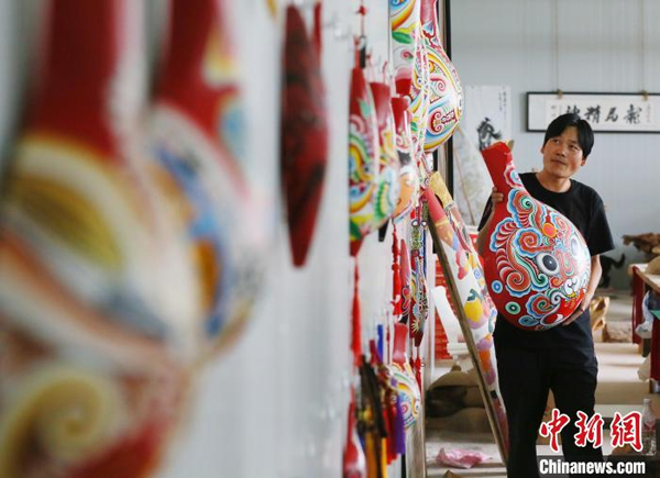 马龙还创新了贴金、刻绘等技法,创作了大量民众喜爱的马勺脸谱。图为马龙将成品悬挂在墙上。 高展 摄