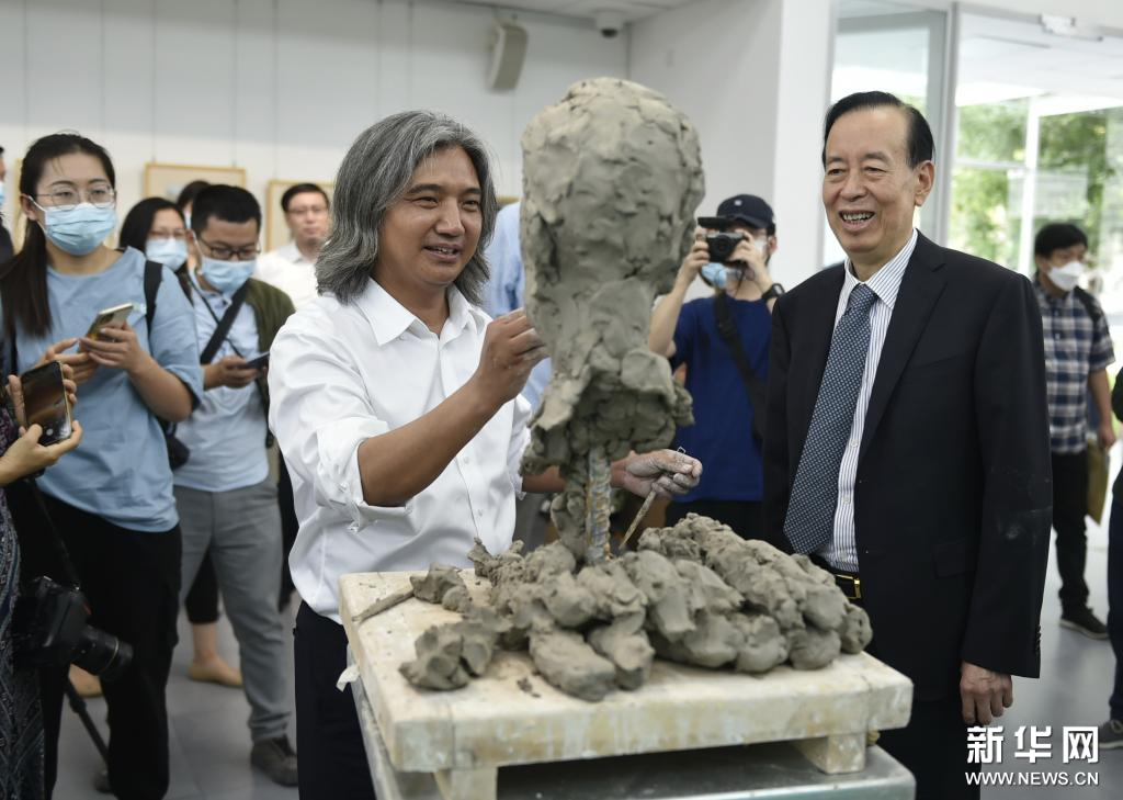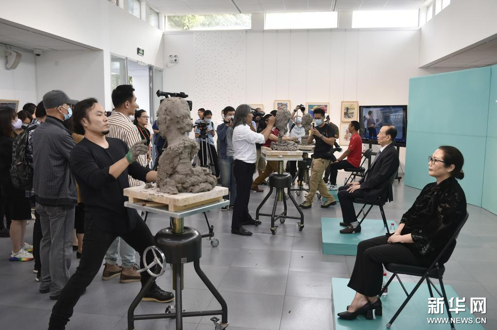 9月9日,中国美术馆馆长吴为山为西安电子科技大学教授郝跃(前右)塑像。新华社记者 鲁鹏 摄