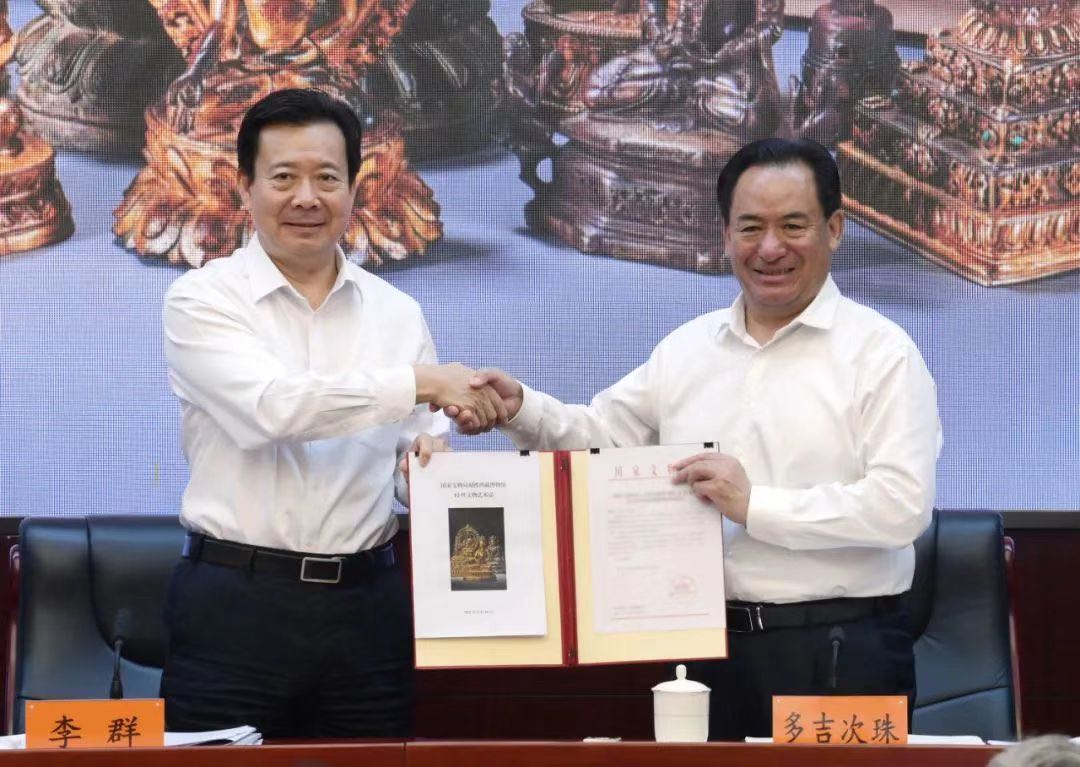 9月26日上午,全国文物援藏工作电视电话会议在京召开,文化和旅游部副部长、国家文物局局长李群与西藏自治区人民政府副主席多吉次珠交接文物划拨清册,将从美国成功追索回国的12件文物艺术品整体划拨西藏博物馆。