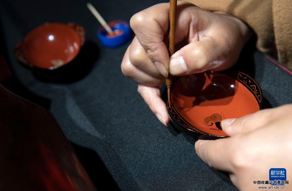 10月18日,艺人在漆器上彩绘。 新华社记者金良快摄