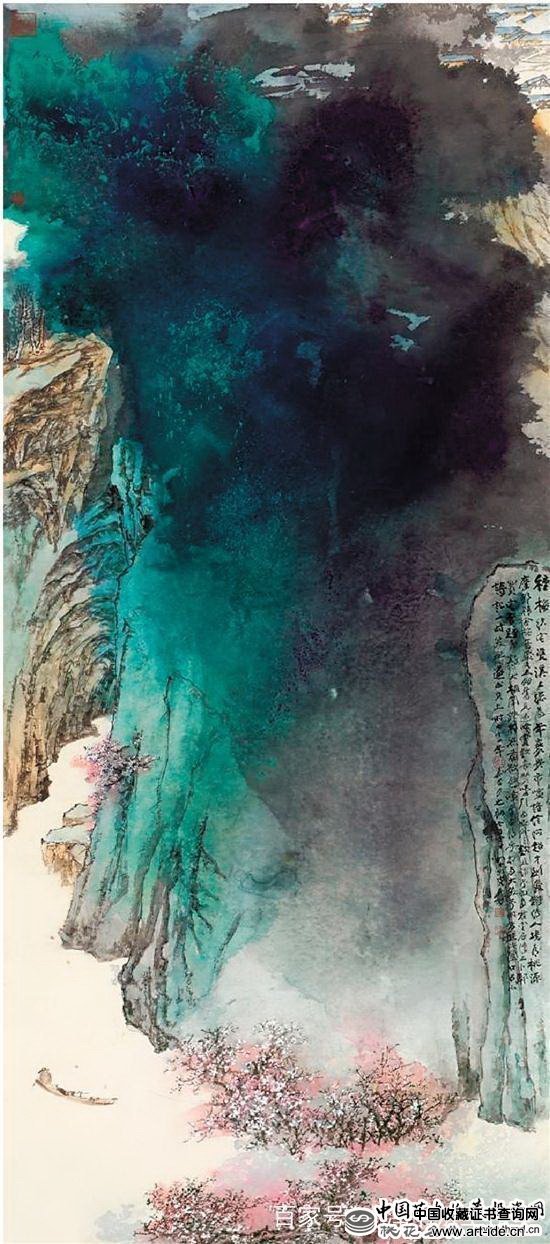 张大千可谓是一位传奇画家,花鸟,山水,人物都精通的全能型画家,其中他的泼墨山水最为让人津津乐道,赞叹不已,他的作品往往是拍卖会抢手作品,他的画作不像前两者一样价格高低起伏,张大千的作品一般都在百万或千万的层次居多,很少会低于百万之下的,此幅作品是张大千的一幅非常精美的作品,山水意境非常的强烈,说是桃园也不为过,此件作品几十年间经过无数次拍卖转手,价格也是翻了几百倍,此次的拍卖作品拍出这个价格,对于市场行情,也是在情理之中的。