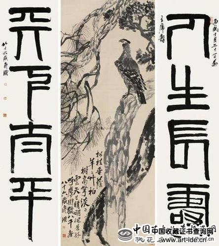 拍品介绍:齐白石代表作《松柏高立图·篆书四言联》,长266厘米,宽100厘米,为历年公私所见齐白石最大尺幅绘画及书法精品。图绘雄鹰傲然立于苍松之上。松鹰是齐白石最喜欢的画题之一,“鹰”寓意“英雄”,刚健有力,而“松柏”则有长寿之喻。所匹配的篆书“人生长寿,天下太平”对联,单幅纵264.5厘米,横65.8厘米,画面气势宏伟,与之匹配的篆书四言联,则浑厚自然、端庄大气,堪称齐白石书法精品。白石老人此画创作于1945年抗战胜利后,其时画家86岁,正是齐白石艺术创作的成熟期。作品表达了画家对国家民族和平发展的美好祈望,当时为蒋介石六十寿庆所作。2005年由美国旧金山私人释出后流入大陆,此番亮相受到藏家热烈关注。