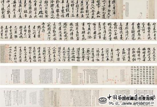 拍品介绍:黄庭坚《砥柱铭》,行书。该卷长达8.24米,抄录唐代魏征《砥柱铭》,全文82行407字。卷上有宋代贾似道、明代项元汴直至清代民国藏家的大量题跋和钤印。黄庭坚大字行书凝练有力,结构独特,是北宋书坛杰出的代表,与苏轼、米芾、蔡襄并称“宋四家”。