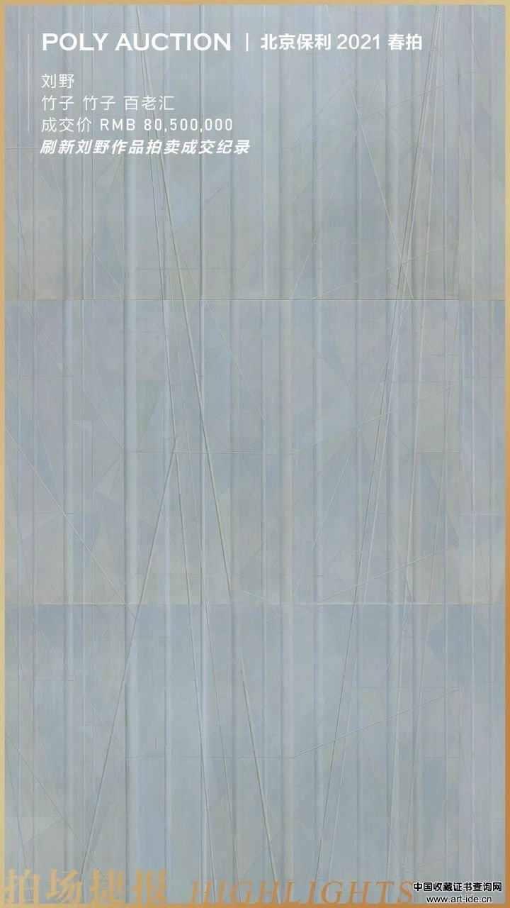 2021保利北京春季拍卖的「现当代艺术夜场」宽达9米的抽象大作《竹子 竹子 百老汇》亦以RMB 8,050万成交,刷新另一位中国当代艺术旗手、刘野之个人拍卖纪录。