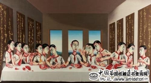 拍品介绍:曾梵志的《最后的晚餐》创作于二〇〇一年,原画中的耶稣及十二个门徒,被换上戴上面具、吃着西瓜及系红领巾的少先队成员。艺术家邀请了一班青年为其模特儿,为每一个姿势都单独地拍摄照片,以便在此基础上进行创作,为其佩戴上红领巾及肩章,而作品后方有着狂草笔触的书法,取材自中国教室中常见的名人毛笔画法。这种把宗教场所转变为教室,使作品的空间产生游戏感,充满荒诞性。《最后的晚餐》以恢宏的气势,捕捉了中国社会在九十年代经济转变时期的面貌改变,纪录了中国社会如何面对资本主义的降临。是当代中国艺术中极具代表性的一张作品。成亚洲最贵当代书画作品。