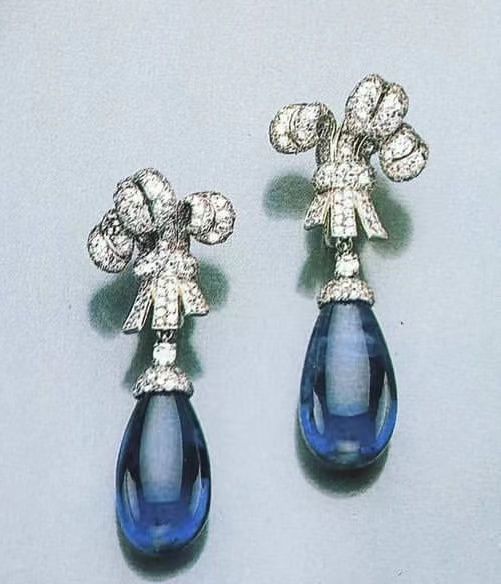 多年后,公爵又从海瑞·温斯顿选购了两枚加起来重达75.51克拉的水滴型蓝宝石。交给卡地亚进行镶嵌,采用的是威尔士亲王的徽章样式——三根鸵鸟羽毛。