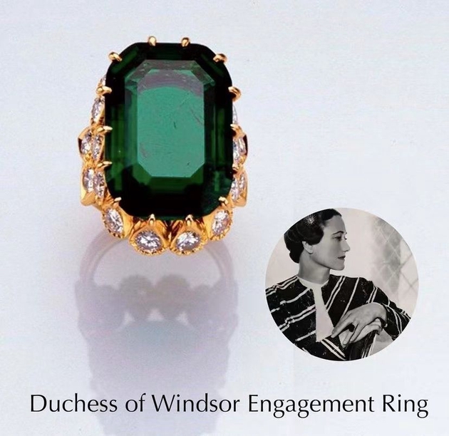 在后来二人订婚时,爱德华送给沃利斯的依然是刻字的祖母绿钻石订婚戒指。