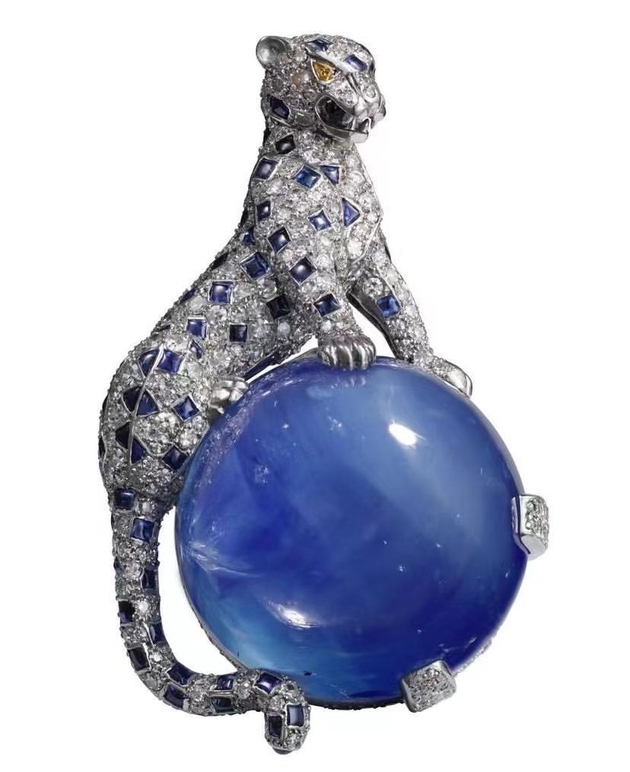 在重达152.35克拉的凸圆形克什米尔蓝宝石上,猎豹的形态以铂金为底,镶嵌钻石和蓝宝石,既霸气又很可爱。
