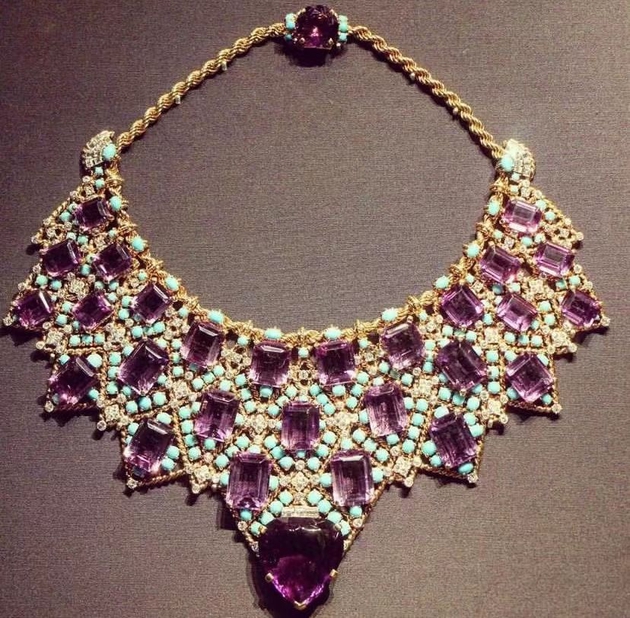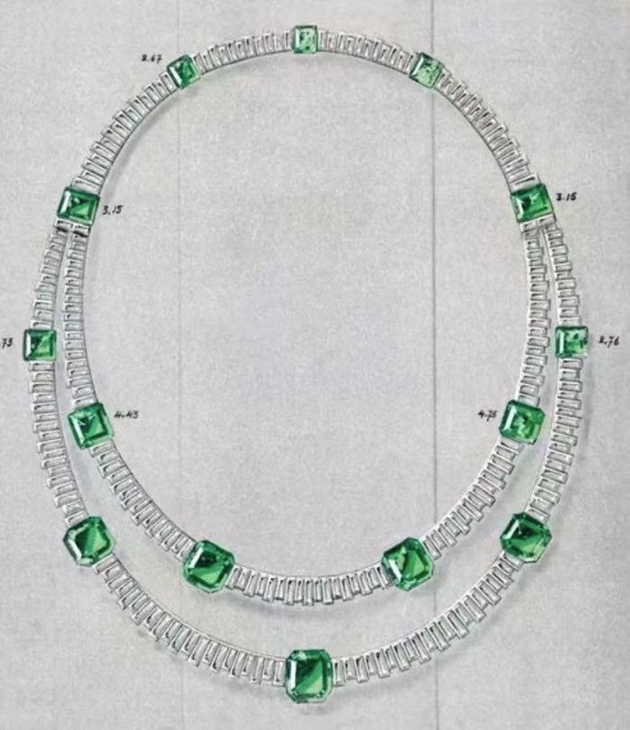 其实当时的公爵夫妇的审美逐渐偏向异域风情,比如在1947年时,通过卡地亚定制了一条“围兜式”项链,温莎公爵还参与了设计。