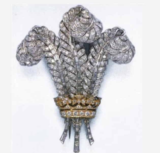 这三根羽毛是三根驼鸟毛,是爱德华当年王位继承人身份的象征,他将这件胸针送给沃利斯,预示着他将让成为他未来的皇后。