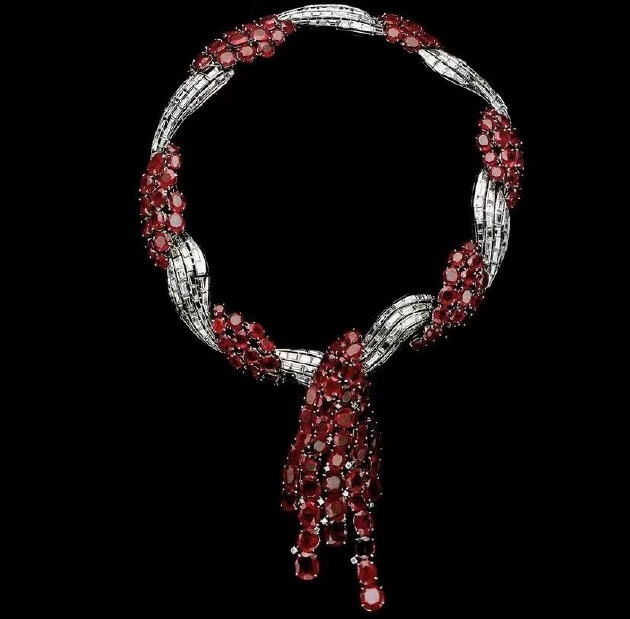 与手链同套的还有一条由101颗红宝石与钻石镶嵌的项链,项链背面更是写着“My Wallis from her David。”