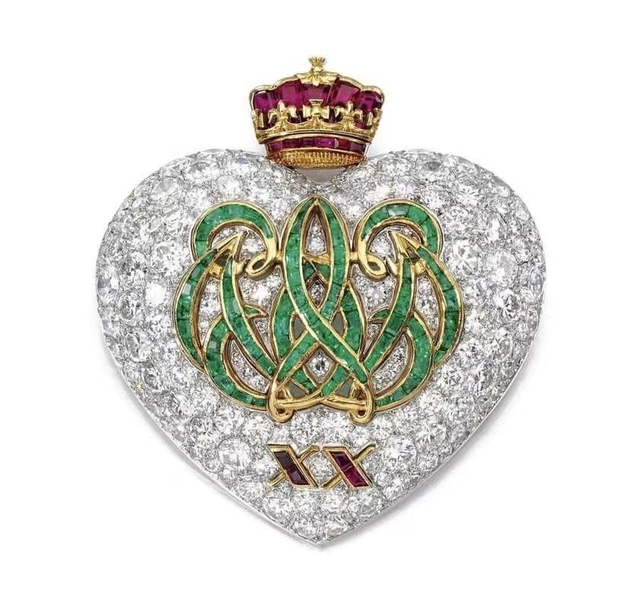 在他们20周年结婚纪念日,公爵在卡地亚定制了一枚爱心形状的钻石胸针,这次爱德华不再隐晦表达爱意,直接大剌剌地用祖母绿镶嵌成W和E两个字母。