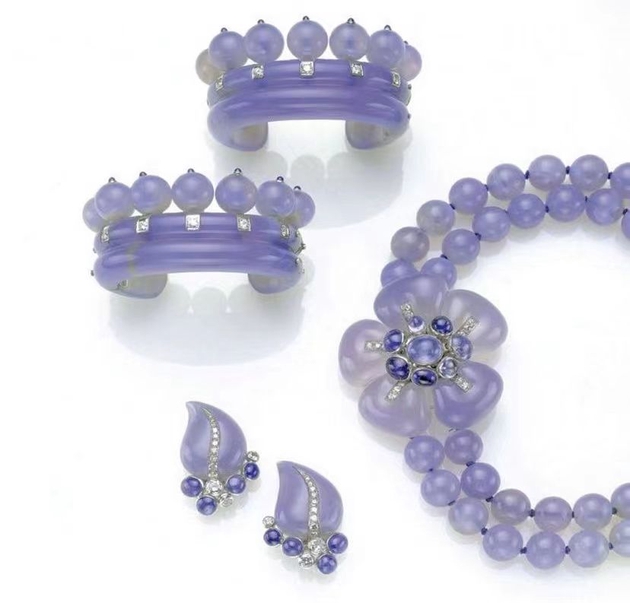 比如这一组来自Belperron(美国珠宝品牌Suzanne Belperron,至今在纽约第五大道开有实体店)的蓝玉髓、蓝宝石与钻石打造的花朵珠宝套装。