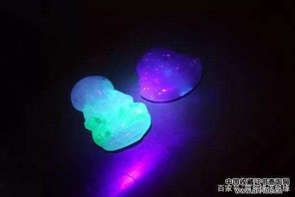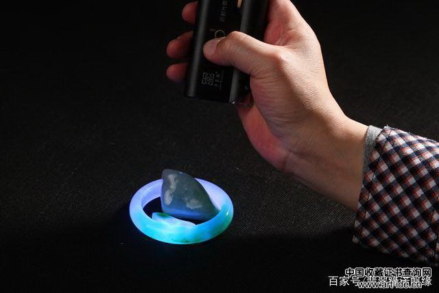 例如B货翡翠在紫外线灯照射下,通体会发出荧光反应,因此翡翠是否有荧光,是判断翡翠真假性的重要依据。