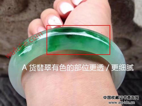 A货翡翠手镯有颜色的部位比白色部位更透明、玉质也更细腻。