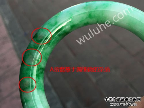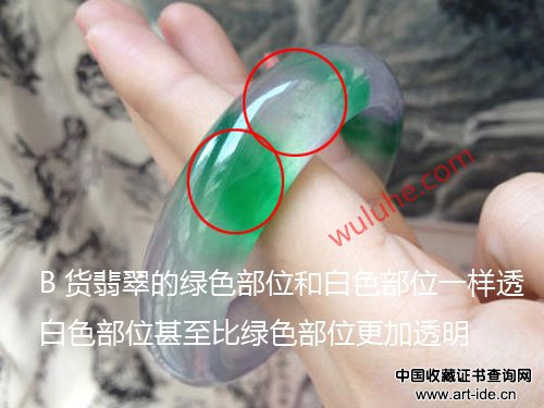 这种方法,特别适合不透明的B货翡翠手镯,看白色部位即可。