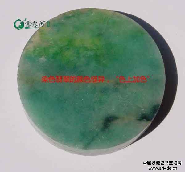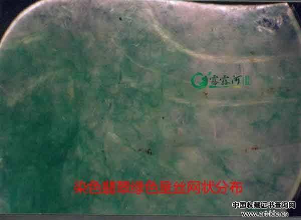 天然翡翠颜色有色根,颜色有形,分布不均匀,染色翡翠颜色发散,无形,有浮感,呈丝网状分布于表层。