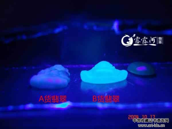 B货翡翠在荧光灯下有较强的荧光。