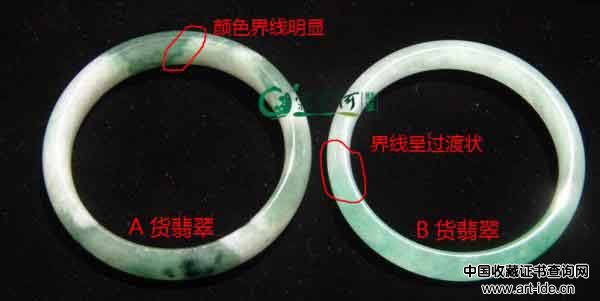 A货翡翠透明度不均匀,透明与不透明部位界线分明;B货翡翠透明度各处一致,绿色与白色界线为逐渐过渡。