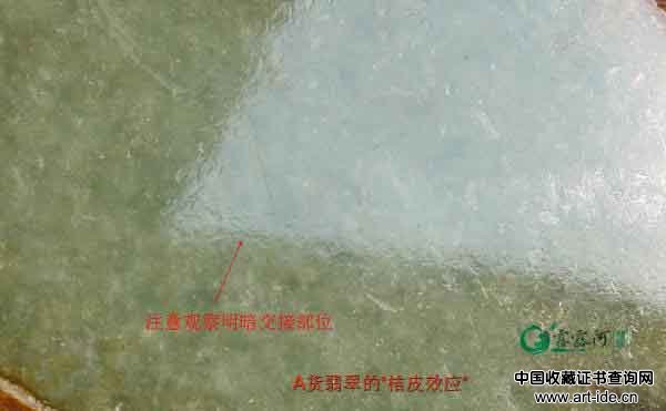 天然翡翠在抛光平面上,通过反光观察,会表现出大小、方向不同的一个个突起与凹陷——桔皮效应,A货翡翠突起与凹陷的界线为逐渐平滑过渡。