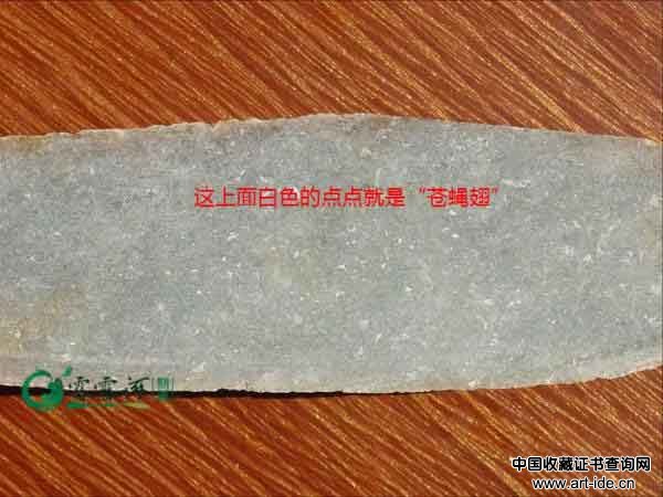 翡翠反射光下观察,粗糙面上可见到的硬玉矿物的解理面反光,即为“苍蝇翅” ,光滑平面上,通过聚光电筒照明,也可以看到“苍蝇翅”,如果能看到苍蝇翅,说明翡翠的质地比较粗糙。