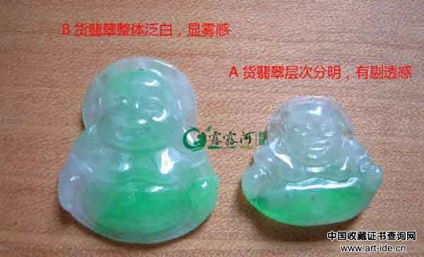 A货翡翠的有色部位相对透明,B货翡翠总体泛白,有雾感,浑浊不清;透明度各处一致。
