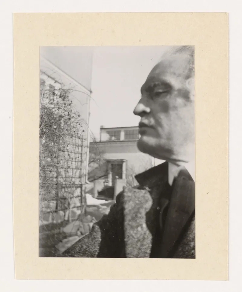 爱德华·蒙克:戴帽子的侧脸自拍,1930年,于埃克利冬季工作室的台阶上。Photo © Munchmuseet