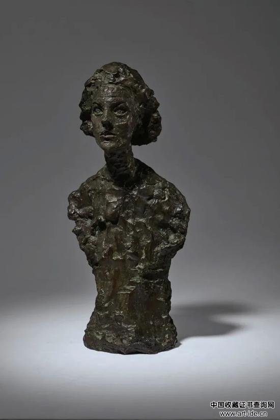 阿尔伯托·贾克梅蒂(1901-1966) 《安妮特半身像VIII》,1962年构思,1965年铸造。青铜、啡色及绿色铜锈。高23英寸(58.5公分)。此拍品于2019年11月11日在佳士得纽约售出,成交价3,135,000美元。艺术品:© The Estate of Alberto Giacometti (Fondation Giacometti, Paris and ADAGP, Paris), licensed in the UK by ACS and DACS, London 2020