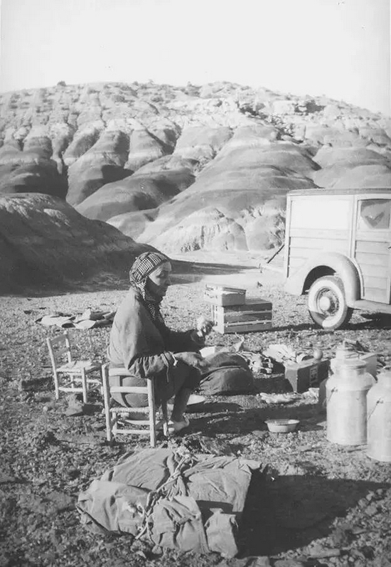 晚年的欧姬芙坐在烈日底下的旷野中,该地位于美国新墨西哥州阿比丘(Abiquiu)小镇。